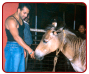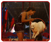 There are seven horses in the Equestrian department of Jumbocircus. All ofthem are performers. They have healthy and dynamic bodies which add to their majestic appearance. Ideal for Cossack riding performance with Russian artistes. They bring life to the ring by their lively performance.They can go faster than a car. Thirty-year old Tarzan is the eldest in the group. Seven-year old Sultan has a striking appearance because of his milky white complexion.Ten-year old Geetha, one and half-year old Karan, six-year old Raja and six-year old Deepak are the other horses in the group. In the morning the Horse generally have chana(grams) atta flour. At 1.00 in the afternoon they are given carrots and grass. In the evening at around 7.00 pm milk with raw egg and oxylates are also given. At 8.00 in the night thick chapathies with jaggery and ghee are given to them. The thirty-year old Hobra is an exotic hybrid of a horse and a zebra. This was given as a gift by the Great Oriental circus. The Camels hate rain and the cool climate. They are very happy in places with more humidity, the neem leaves is their favourite. They are given fenugreek with gramflour. Five-year old Jyothi, one-year old Geetha and five-year old Savithri are the three camels. The dog is a subspecies of the wolf a mammal. Dogs are considered to be the most loyal and hence they have a unique rapport with humans. It is note worthy that people in general enjoy the most during the Dog act in the Circus. The dog family in the Circus has the following breed; Pomeranian, Dalmatian, Bond, Russian Poodle and Dash. The Persian cat family consists of two parents and the remaining kitten. All the animals are well-fed, healthy and looked after by a regular Vet.